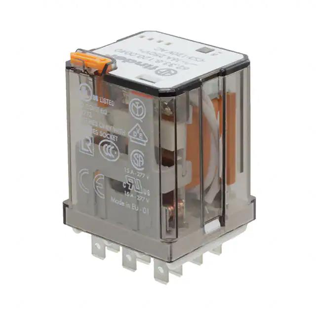 This is manufactured by Finder Relays, Inc.. The manufacturer part number is 62.33.8.120.0050. It is assigned with possible HTSUS value of 8536.49.0075. The product is rohs3 compliant. The coil voltage of the product is 120vac. Moreover, it has plug in, quick connect - 0.187" (4.7mm) terminal style. In addition, it is reach unaffected. The product has -40°c ~ 70°c operating temperature range. It holds up to 1.94 kohms coil resistance. It has a coil current of 18.6 ma. The coil is a non latching type. The product's switching voltage is 400vac - max. On the other hand, 96 vac is the given crucial/must operating voltage. This is basically a general purpose. It is shipped in bulk. It also has a 3pdt (3 form c) contact form. Its typical moisture sensitivity level is not applicable. The operating time of the product is 11 ms. While the must release voltage is a 24 vac. It has a long 6 weeks standard lead time. It has a contact current rating of 16 a. The splendid features of the product include lighted indicator, test button. The product is available in socketable configuration. The product 62, is a highly preferred choice for users. While 4 ms is its release time. The product is made from sturdy silver cadmium oxide (agcdo) materials. Moreover, it corresponds to 62.33.8, a base product number of the product. The product is designated with the ear99 code number