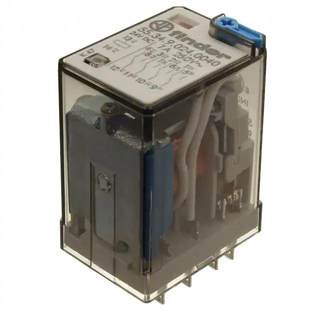 This is manufactured by Finder Relays, Inc.. The manufacturer part number is 55.34.9.024.0040. It is assigned with possible HTSUS value of 8536.41.0020. The product is rohs3 compliant. The coil voltage of the product is 24vdc. Moreover, it has plug in terminal style. In addition, it is reach unaffected. The product has -40°c ~ 85°c operating temperature range. It has a coil current of 40 ma. The coil is a non latching type. The product's switching voltage is 250vac - max. On the other hand, 19.2 vdc is the given crucial/must operating voltage. This is basically a general purpose. It is shipped in bulk. It also has a 4pdt (4 form c) contact form. Its typical moisture sensitivity level is not applicable. The operating time of the product is 9 ms. While the must release voltage is a 4.8 vdc. It has a long 6 weeks standard lead time. It has a contact current rating of 7 a. The splendid features of the product include mechanical indicator, test button. The product is available in socketable configuration. The product 55, is a highly preferred choice for users. While 5 ms is its release time. The product is made from sturdy silver nickel (agni) materials. Moreover, it corresponds to 55.34.9, a base product number of the product. The product is designated with the ear99 code number