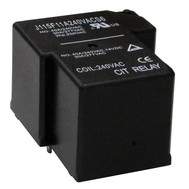 This is manufactured by CIT Relay and Switch. The manufacturer part number is J115F11A240VACS6. It is assigned with possible HTSUS value of 8536.49.0075. The product is rohs compliant. The coil voltage of the product is 240vac. Moreover, it has pc pin terminal style. In addition, it is reach unaffected. The product has -55°c ~ 125°c operating temperature range. It holds up to 15.32 kohms coil resistance. It has a coil current of 15.7 ma. The coil is a non latching type. The product's switching voltage is 277vac, 110vdc - max. Seal rating options: sealed - fully. On the other hand, 180 vac is the given crucial/must operating voltage. This is basically a general purpose. It is shipped in tube. It also has a spst-no (1 form a) contact form. Its typical moisture sensitivity level is 1 (unlimited). The operating time of the product is 15 ms. While the must release voltage is a 72 vac. It has a long 49 weeks standard lead time. It has a contact current rating of 40 a. The product is available in through hole configuration. The product j115f1, is a highly preferred choice for users. While 10 ms is its release time. The coil is a class f insulation. The product is made from sturdy silver tin oxide (agsno) materials. Moreover, it corresponds to j115f11, a base product number of the product. The product is designated with the ear99 code number
