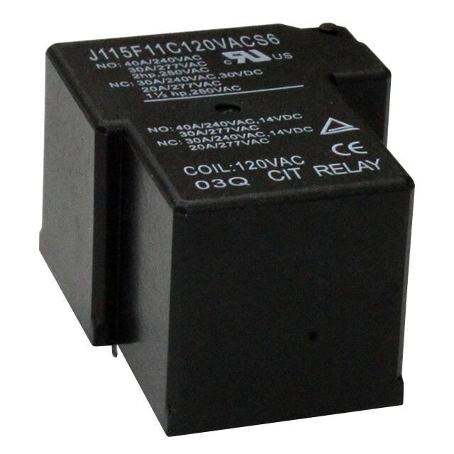 This is manufactured by CIT Relay and Switch. The manufacturer part number is J115F11C120VACS6. It is assigned with possible HTSUS value of 8536.49.0075. The product is rohs compliant. The coil voltage of the product is 120vac. Moreover, it has pc pin terminal style. In addition, it is reach unaffected. The product has -55°c ~ 125°c operating temperature range. It holds up to 3.04 kohms coil resistance. It has a coil current of 39.5 ma. The coil is a non latching type. The product's switching voltage is 277vac, 110vdc - max. Seal rating options: sealed - fully. On the other hand, 90 vac is the given crucial/must operating voltage. This is basically a general purpose. It is shipped in tube. It also has a spdt (1 form c) contact form. Its typical moisture sensitivity level is 1 (unlimited). The operating time of the product is 15 ms. While the must release voltage is a 36 vac. It has a long 49 weeks standard lead time. It has a contact current rating of 40 a. The product is available in through hole configuration. The product j115f1, is a highly preferred choice for users. While 10 ms is its release time. The coil is a class f insulation. The product is made from sturdy silver tin oxide (agsno) materials. Moreover, it corresponds to j115f11, a base product number of the product. The product is designated with the ear99 code number