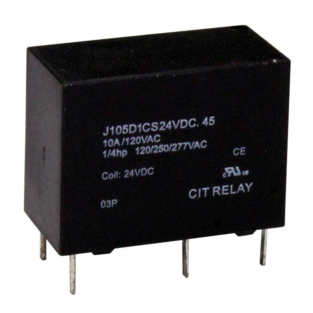 This is manufactured by CIT Relay and Switch. The manufacturer part number is J105D1CS24VDC.45. It is assigned with possible HTSUS value of 8536.41.0050. The product is rohs compliant. The coil voltage of the product is 24vdc. Moreover, it has pc pin terminal style. In addition, it is reach unaffected. The product has -55°c ~ 125°c operating temperature range. It holds up to 1.28 kohms coil resistance. It has a coil current of 18.8 ma. The coil is a non latching type. The product's switching voltage is 277vac - max. Seal rating options: sealed - fully. On the other hand, 18 vdc is the given crucial/must operating voltage. This is basically a general purpose. It is shipped in tray. It also has a spdt (1 form c) contact form. Its typical moisture sensitivity level is 1 (unlimited). The operating time of the product is 10 ms. While the must release voltage is a 2.4 vdc. It has a long 20 weeks standard lead time. It has a contact current rating of 10 a. The product is available in through hole configuration. The product j105d, is a highly preferred choice for users. While 10 ms is its release time. The product is made from sturdy silver tin oxide (agsno) materials. Moreover, it corresponds to j105d1cs, a base product number of the product. The product is designated with the ear99 code number