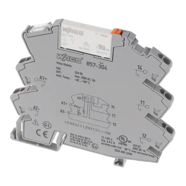 This is manufactured by WAGO Corporation. The manufacturer part number is 857-304. It is assigned with possible HTSUS value of 8536.41.0020. The product is rohs3 compliant. The coil voltage of the product is 24vdc. Moreover, it has spring terminal terminal style. In addition, it is reach affected. The product has -40°c ~ 60°c operating temperature range. It holds up to 2.4 kohms coil resistance. It has a coil current of 10 ma. The coil is a non latching type. The product's switching voltage is 250vac - max. On the other hand, 4.8 vdc is the given crucial/must operating voltage. This is basically a general purpose. It is shipped in bulk. It also has a spdt (1 form c) contact form. Its typical moisture sensitivity level is 1 (unlimited). The operating time of the product is 8 ms. While the must release voltage is a 3.6 vdc. It has a long 8 weeks standard lead time. It has a contact current rating of 6 a. The splendid features of the product include lighted indicator, socket included. The product is available in din rail configuration. While 8 ms is its release time. The product is made from sturdy silver tin oxide (agsno) materials. Moreover, it corresponds to 857, a base product number of the product. The product is designated with the ear99 code number