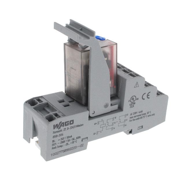 This is manufactured by WAGO Corporation. The manufacturer part number is 858-304. It is assigned with possible HTSUS value of 8536.41.0020. The product is rohs3 compliant. The coil voltage of the product is 24vdc. Moreover, it has spring terminal terminal style. In addition, it is reach unaffected. The product has -25°c ~ 70°c operating temperature range. It holds up to 650.4 ohms coil resistance. It has a coil current of 36.9 ma. The coil is a non latching type. The product's switching voltage is 250vac - max. On the other hand, 19.2 vdc is the given crucial/must operating voltage. This is basically a general purpose. It is shipped in bulk. It also has a 4pdt (4 form c) contact form. Its typical moisture sensitivity level is 1 (unlimited). The operating time of the product is 25 ms. It has a long 8 weeks standard lead time. It has a contact current rating of 5 a. The splendid features of the product include lighted indicator, mechanical indicator. The product is available in din rail configuration. While 25 ms is its release time. The product is made from sturdy silver cerium (agce) materials. Moreover, it corresponds to 858, a base product number of the product. The product is designated with the ear99 code number