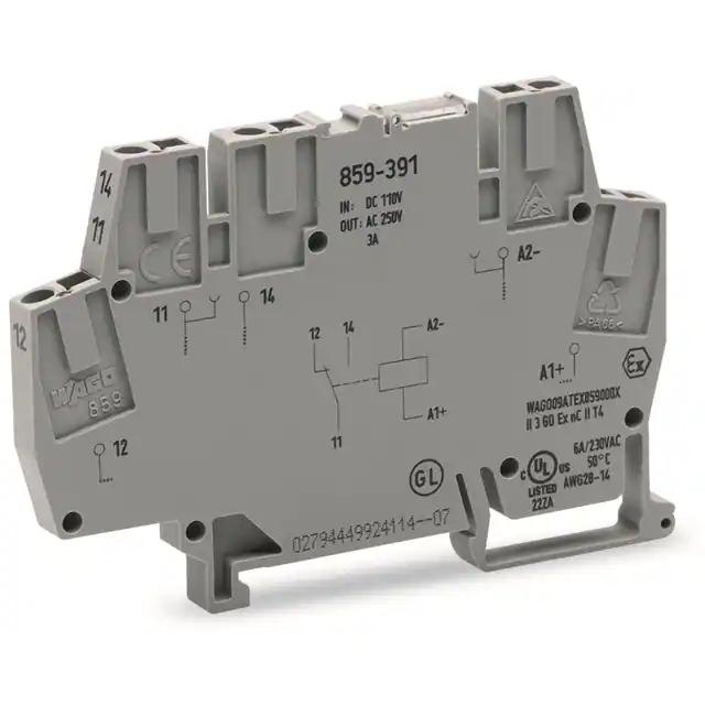 This is manufactured by WAGO Corporation. The manufacturer part number is 859-391. It is assigned with possible HTSUS value of 8536.49.0050. The product is rohs3 compliant. The coil voltage of the product is 110vdc. Moreover, it has spring terminal terminal style. The product has -40° ~ 70°c operating temperature range. It has a coil current of 2.7 ma. The coil is a non latching type. The product's switching voltage is 250vac - max. This is basically a general purpose. It is shipped in box. It also has a spdt (1 form c) contact form. Its typical moisture sensitivity level is not applicable. The operating time of the product is 15 ms. It has a long 12 weeks standard lead time. It has a contact current rating of 5 a. The splendid features of the product include lighted indicator. The product is available in din rail configuration. The product 859, is a highly preferred choice for users. While 25 ms is its release time. The product is designated with the ear99 code number The product is made from sturdy silver tin oxide (agsno) materials.
