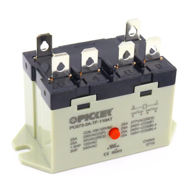 This is manufactured by Picker Components. The manufacturer part number is PC673-2A-TF-110AT. It is assigned with possible HTSUS value of 8536.49.0075. The product is rohs3 compliant. The coil voltage of the product is 110vac. Moreover, it has quick connect - 0.250" (6.3mm) terminal style. In addition, it is reach unaffected. The product has -25°c ~ 60°c operating temperature range. It holds up to 5.2 kohms coil resistance. It has a coil current of 21.2 ma. The coil is a non latching type. The product's switching voltage is 277vac, 150vdc - max. On the other hand, 88 vac is the given crucial/must operating voltage. This is basically a general purpose. It is shipped in bag. It also has a dpst-no (2 form a) contact form. Its typical moisture sensitivity level is 1 (unlimited). The operating time of the product is 30 ms. While the must release voltage is a 11 vac. It has a long 17 weeks standard lead time. It has a contact current rating of 25 a. The splendid features of the product include test button. The product is available in chassis mount configuration. While 30 ms is its release time. The coil is a class f insulation. The product is made from sturdy silver alloy materials. The product is designated with the ear99 code number