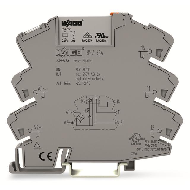 This is manufactured by WAGO Corporation. The manufacturer part number is 857-364. It is assigned with possible HTSUS value of 8536.41.0020. The product is rohs3 compliant. The coil voltage of the product is 24vac/dc. Moreover, it has spring terminal terminal style. The product has -40°c ~ 60°c operating temperature range. It has a coil current of 8.5 ma. The product's switching voltage is 250vac - max. This is basically a general purpose. It is shipped in box. It also has a spdt (1 form c) contact form. Its typical moisture sensitivity level is not applicable. The operating time of the product is 15 ms. It has a long 12 weeks standard lead time. It has a contact current rating of 6 a. The splendid features of the product include lighted indicator. The product is available in din rail configuration. The product 857, is a highly preferred choice for users. While 25 ms is its release time. The product is designated with the ear99 code number The product is made from sturdy silver nickel (agni), gold (au) materials.