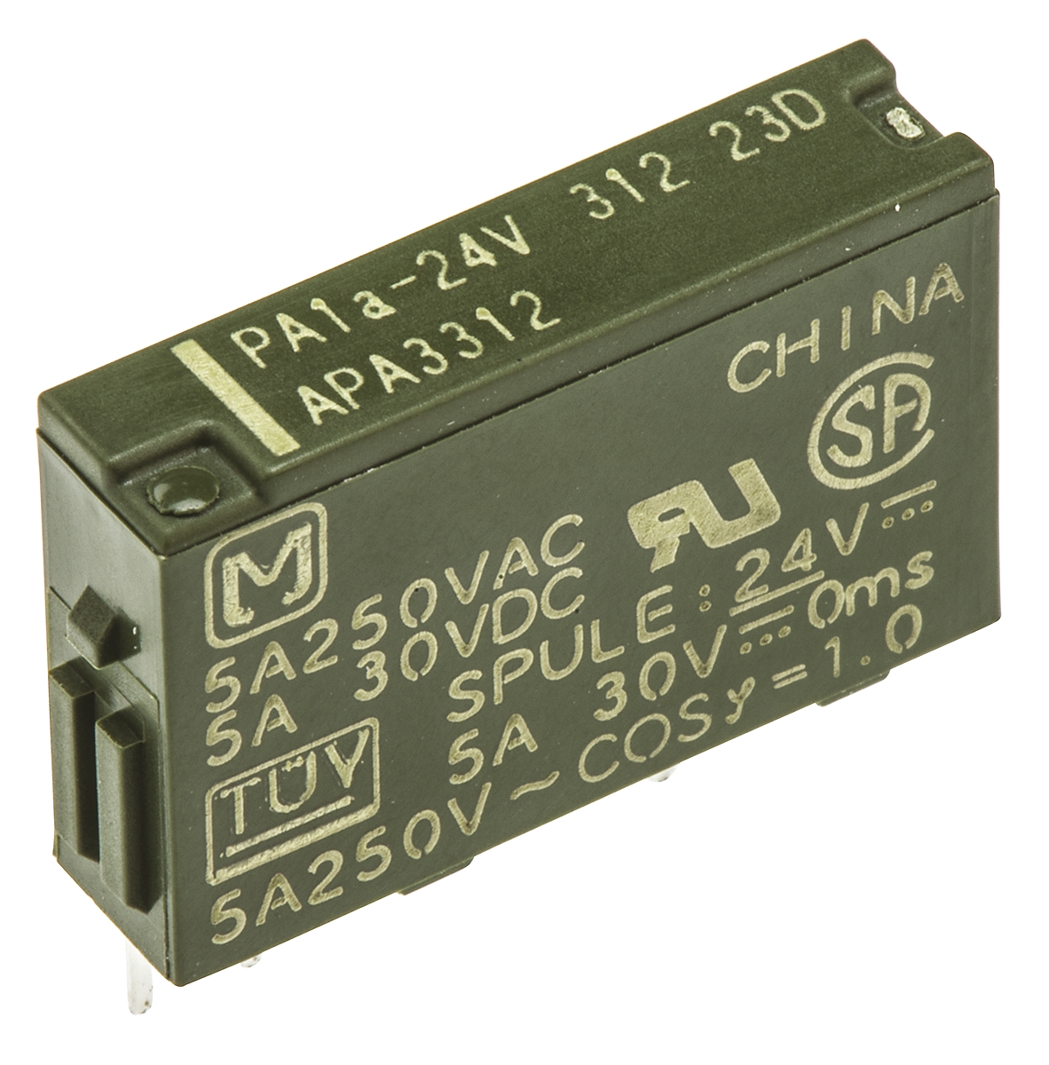 This is SPNO Non-Latching Relay PCB Mount 24V dc Coil 5 A manufactured by Panasonic. The manufacturer part number is PA1A24. The given dimensions of the product include 21 x 5 x 12.8mm. The product is available in pcb mount configuration. Robust coil power of 180mw. The coil voltage of the product is 24v dc. Whereas, the minimum operating temperature of the product is -40°c. The product comes in 5mm depth. In addition, the height is 12.8mm. Its accurate length is 21mm. The product is made from sturdy gold plated materials. It has a maximum operating temperature of +70°c. The terminal is a through hole type. It holds up to 3.2 kω coil resistance.