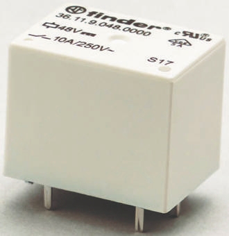 This is SPDT Non-Latching Relay PCB Mount 48V dc Coil 10 A manufactured by Finder. The manufacturer part number is 36.11.9.048.4011. The product is available in pcb mount configuration. Robust coil power of 360mw. The product 36 series, is a highly preferred choice for users. The coil voltage of the product is 48v dc. Its accurate length is 19mm. In addition, the height is 15mm. The product comes in 15.5mm depth. It has equipped with 1 poles. The terminal is a through hole type. It holds up to 6400ω coil resistance.