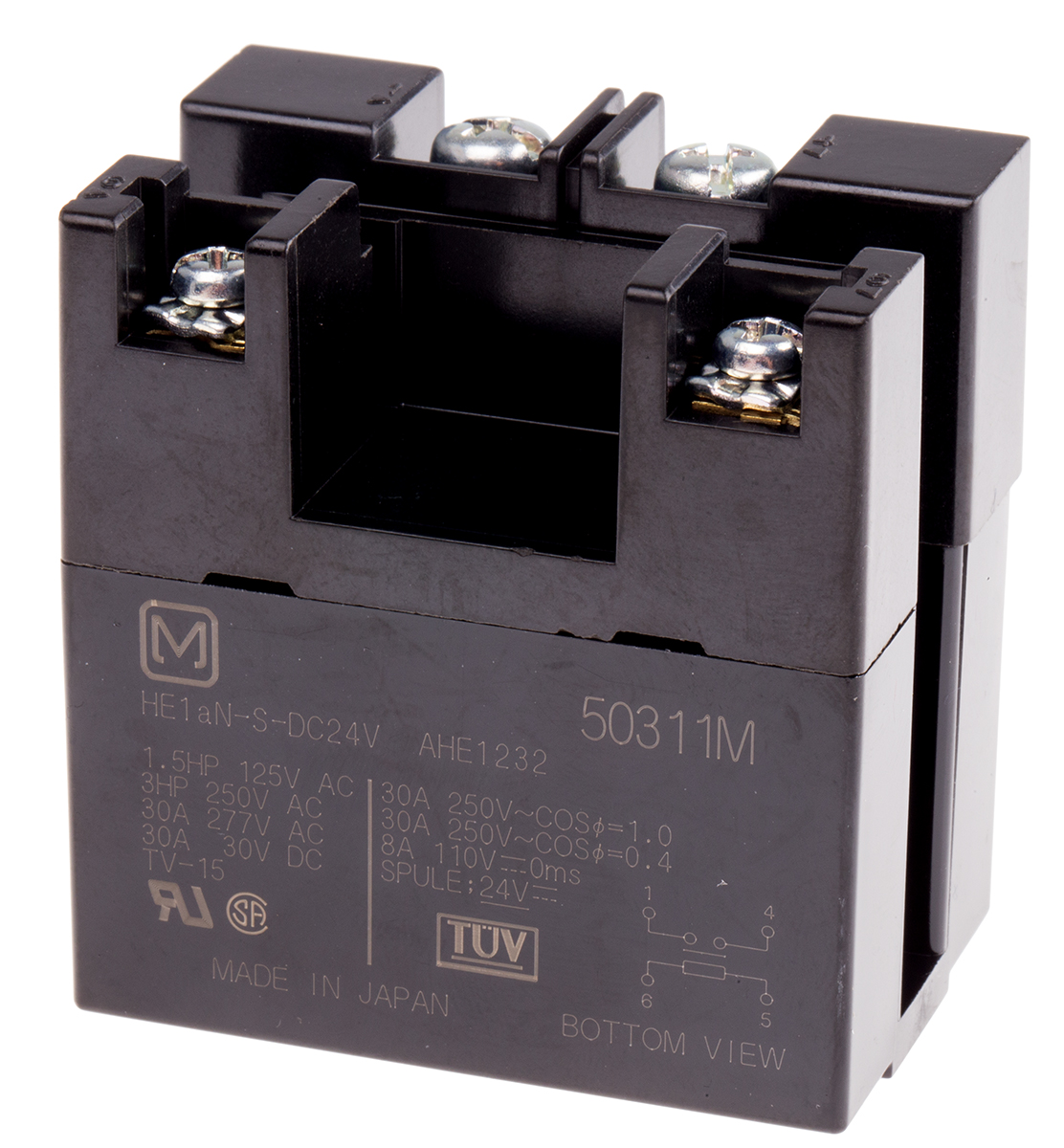 This is 24V dc Coil Non-Latching Relay SPNO 30A Switching Current PCB Mount HE1ANS24 manufactured by Panasonic. The manufacturer part number is HE1AN-S-DC24V. The product is available in pcb mount configuration. Robust coil power of 1.92w. The coil voltage of the product is 24v dc. Its accurate length is 50mm. In addition, the height is 44.5mm. The product comes in 16.5mm depth. It has equipped with 1 poles. The terminal is a screw type. It holds up to 300ω coil resistance.