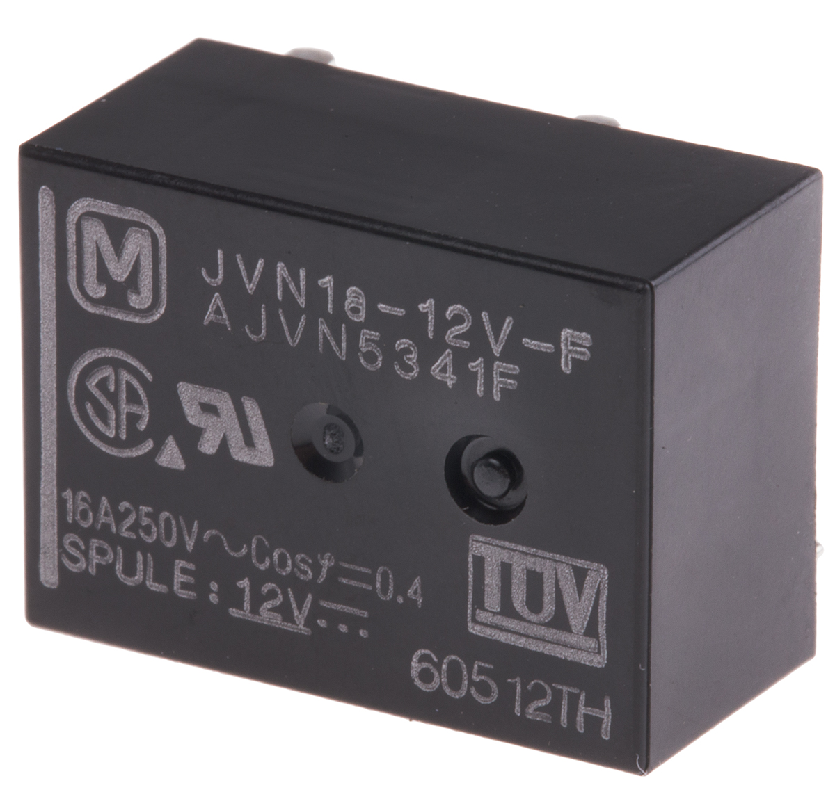 This is 12V dc Coil Non-Latching Relay SPNO 10A Switching Current PCB Mount JVN1A12F manufactured by Panasonic. The manufacturer part number is JVN1A-12V-F. The product is available in pcb mount configuration. Robust coil power of 200mw. The coil voltage of the product is 12v dc. Its accurate length is 22mm. In addition, the height is 10.5mm. The product comes in 16mm depth. It has equipped with 1 poles. The terminal is a through hole type. It holds up to 720ω coil resistance.