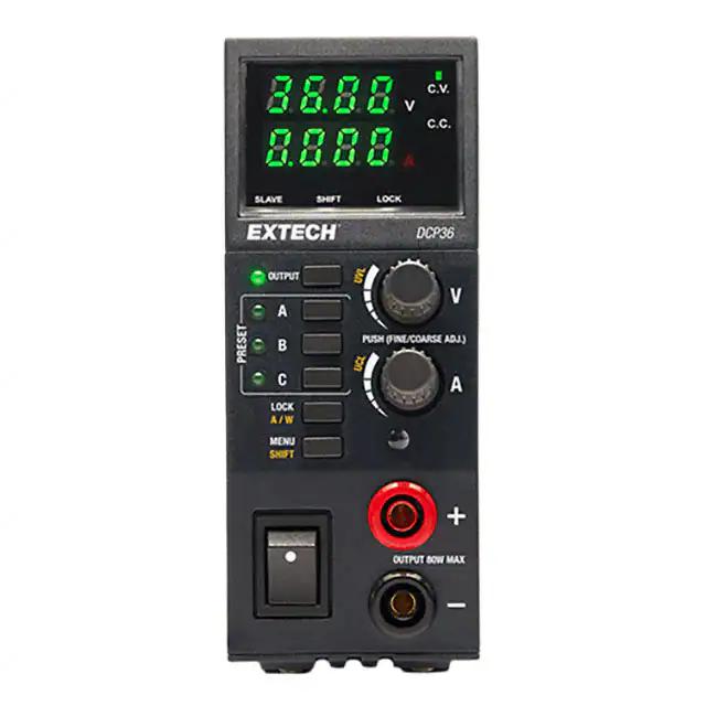 This is manufactured by FLIR Extech. The manufacturer part number is DCP36. It is assigned with possible HTSUS value of 8504.40.9520. Additionally, the product is supplied with 1 outputs. The product features power and watts of 80w. Its typical moisture sensitivity level is 1 (unlimited). It comes in bench (ac to dc) configuration. While, the output current includes 0 ~ 5a. It is shipped in box. The product's diameters include 13.000" l x 2.000" w x 5.000" h (330.20mm x 50.80mm x 127.00mm). Consists of 4 (2) characters. It has a long 6 weeks standard lead time. It features a remarkable led display. The splendid features of the product include constant current and constant voltage indicators, dual display(s). Furthermore, the output voltage is 0.5v ~ 36v. It has optimum voltage supply of 100 ~ 240vac. The product is designated with the ear99 code number