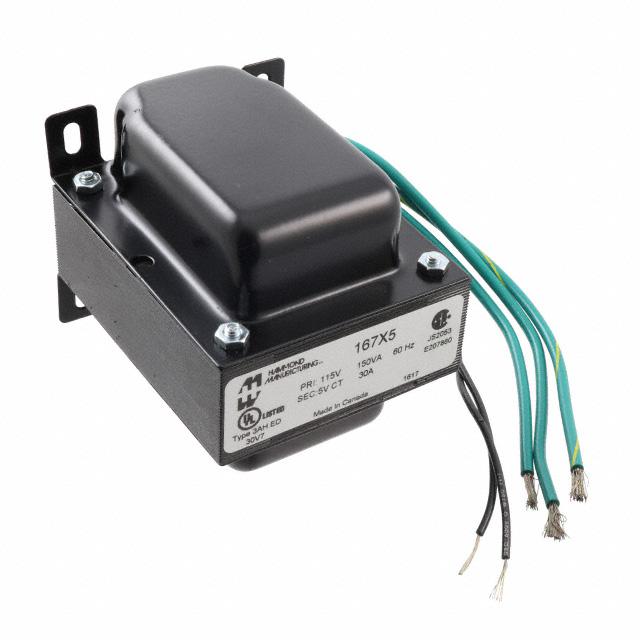This is manufactured by Hammond Manufacturing. The manufacturer part number is 167X5. As well as [Secondary Wing(s)]. It is assigned with possible HTSUS value of 8504.31.4065. The product is rohs3 compliant. Moreover, it has wire leads terminal style. The maximum product's output current is 30a. Features primary voltage 115v. It has the maximum seated height of 96.77mm It comes in laminated core configuration. Features single. In addition, it is reach unaffected. Center Tap - yes. Full load voltage - secondary includes 5v. It is shipped in bulk. The product's diameters include 79.50mm l x 88.90mm w. It has a long 4 weeks standard lead time. 2000vrms of isolation voltage. Its typical moisture sensitivity level is 1 (unlimited). The product is available in chassis mount configuration. The typical product's weight is 5.2 lbs (2.4 kg). The product 167, is a highly preferred choice for users. The maximum power of the product is 150va. The product is designated with the ear99 code number