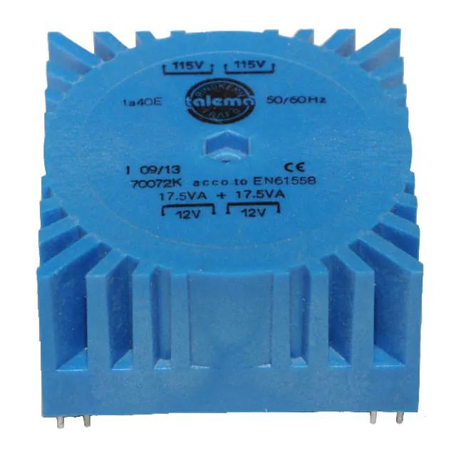 This is manufactured by Talema Group LLC. The manufacturer part number is 70074K. As well as [Secondary Wing(s)]. It is assigned with possible HTSUS value of 8504.31.4035. The product is rohs3 compliant. Moreover, it has pc pin terminal style. The maximum product's output current is parallel 1.944a, series 972ma. Features primary voltage 115v, 230v. It has the maximum seated height of 37.50mm It comes in toroidal configuration. Features dual. In addition, it is reach unaffected. Center Tap - no. Full load voltage - secondary includes parallel 18v, series 36v. It is shipped in tray. The product's diameters include 72.00mm l x 72.00mm w. It has a long 26 weeks standard lead time. 4000vrms of isolation voltage. Its typical moisture sensitivity level is 1 (unlimited). The product is available in through hole configuration. The typical product's weight is 1 lb (453.59 g). The product 7xxxx, is a highly preferred choice for users. The maximum power of the product is 35va. The product is designated with the ear99 code number