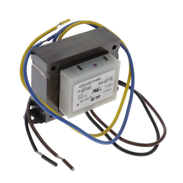 This is manufactured by TE Connectivity Potter & Brumfield Relays. The manufacturer part number is 4000-03E07K999. As well as [Secondary Wing(s)]. It is assigned with possible HTSUS value of 8504.31.4065. The product is rohs compliant. Moreover, it has wire leads terminal style. Features primary voltage 277v. It has the maximum seated height of 55.58mm It comes in laminated core configuration. Features single. Center Tap - no. Full load voltage - secondary includes 24v. It is shipped in bulk. The product's diameters include 90.47mm l x 54.61mm w. Its typical moisture sensitivity level is not applicable. The product is available in chassis mount configuration. The typical product's weight is 1.6 lbs (725.7 g). The product 4000, products unlimited, is a highly preferred choice for users. The maximum power of the product is 40va. Moreover, it corresponds to 4000, a base product number of the product. The product is designated with the ear99 code number