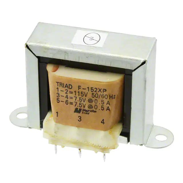 This is manufactured by Triad Magnetics. The manufacturer part number is F-152XP. As well as [Secondary Wing(s)]. It is assigned with possible HTSUS value of 8504.31.4035. The product is rohs3 compliant. Moreover, it has pc pin terminal style. The maximum product's output current is parallel 1a, series 500ma. Features primary voltage 115v. It has the maximum seated height of 41.28mm It comes in laminated core configuration. Features single. In addition, it is reach unaffected. Center Tap - no. Full load voltage - secondary includes parallel 7.5v, series 15v. It is shipped in box. The product's diameters include 71.42mm l x 37.29mm w. It has a long 23 weeks standard lead time. 1500vrms of isolation voltage. Its typical moisture sensitivity level is not applicable. The product is available in chassis mount configuration. The typical product's weight is 0.657 lb (298.01 g). The product single primary, is a highly preferred choice for users. The maximum power of the product is 7.5va. The product is designated with the ear99 code number