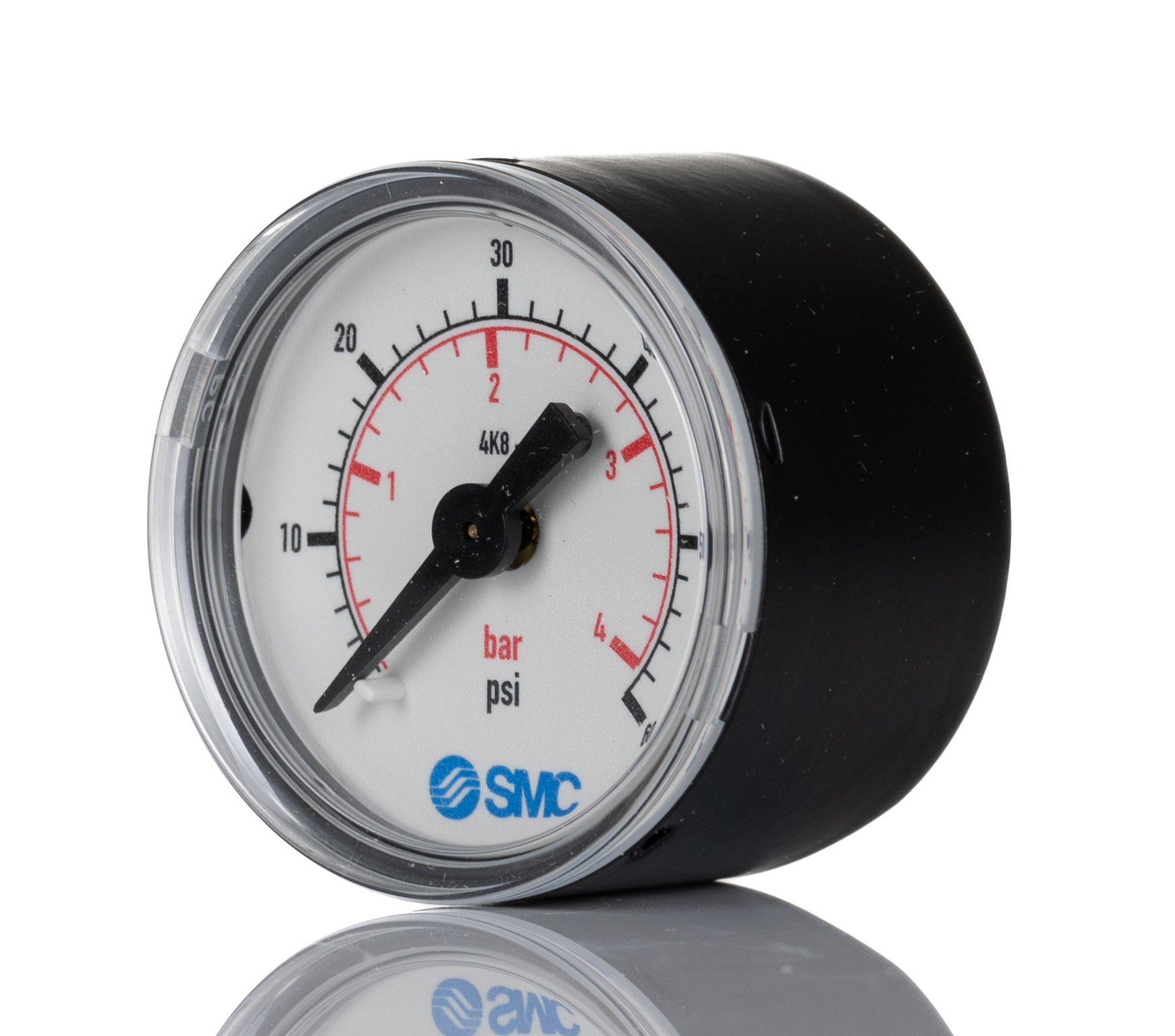 This is Analogue Positive Pressure Gauge Back Entry 4bar Connection Size R 1/8 manufactured by SMC. The manufacturer part number is 4K8-4.