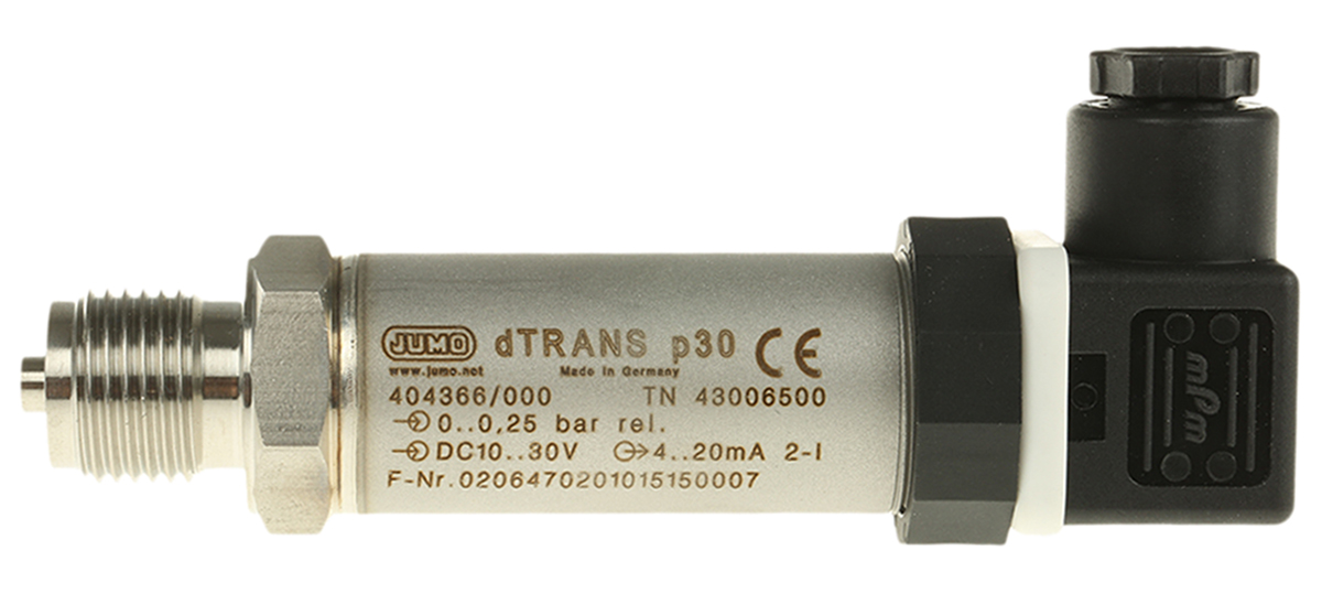 This is Relative Pressure Sensor 0.25bar Max Pressure Reading 10 → 30 V dc G1/2 IP65 manufactured by Jumo. The manufacturer part number is 404366/000-451-405-504-20-61/000. The product also features robust stainless steel housing material. Whereas, the minimum operating temperature of the product is -20°c. It has a maximum operating temperature of +100°c.