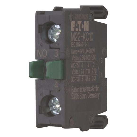 This is Contact Block manufactured by Eaton. The manufacturer part number is 216380 M22-KC10. The product has a current rating of 6a. Moreover, the product has a nominal 500v voltage rating. The product eaton moeller, is a highly preferred choice for users. The terminal is a screw type.