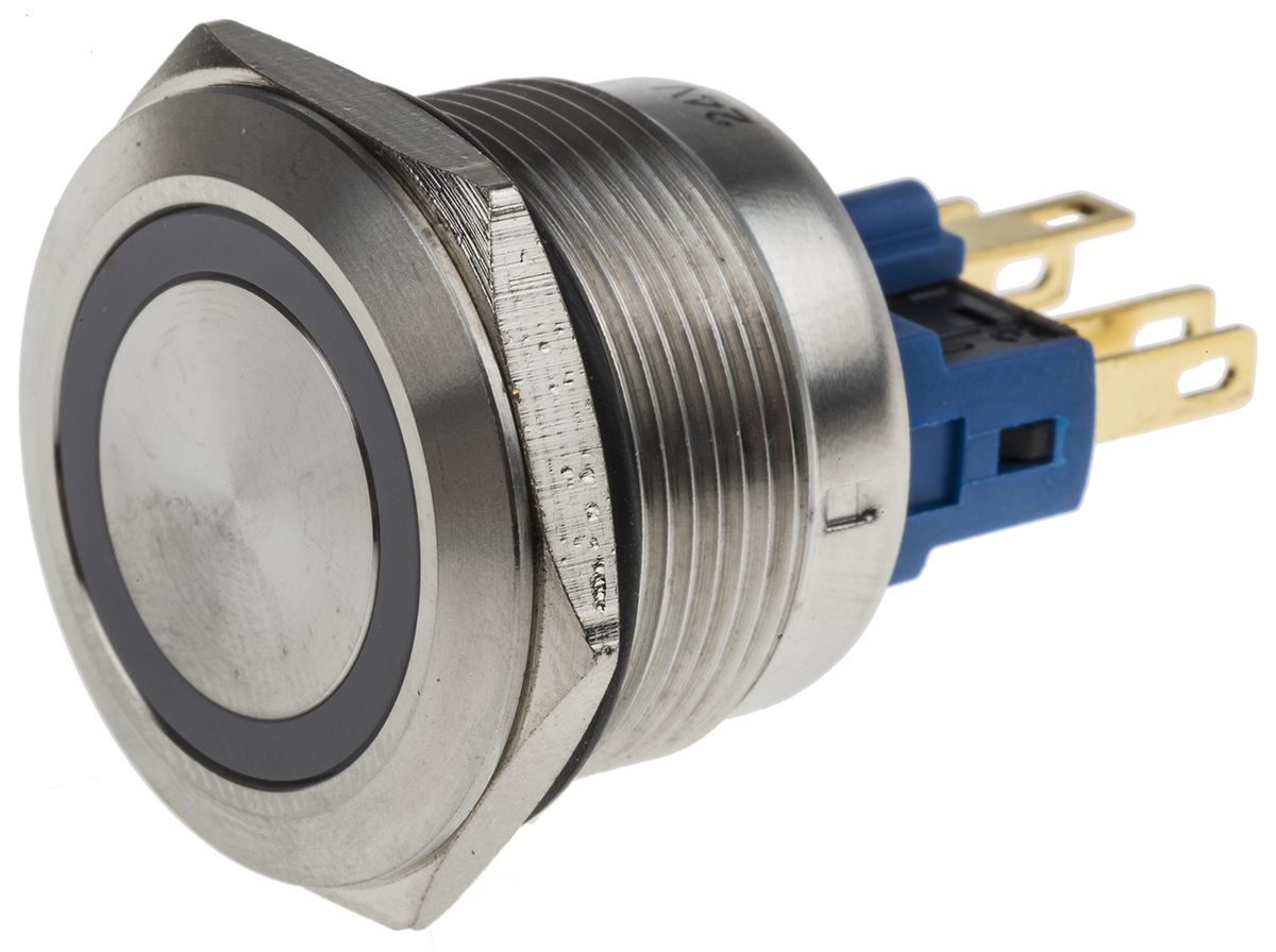 This is SPDT On-Momentary Push Button Switch IP65 IP67 22 (Dia.)mm Panel Mount White LED 250V ac manufactured by RS Pro. The manufacturer part number is 811-8550. The product is available in panel mount configuration. Moreover, the product has a nominal 250v ac voltage rating. The terminal is a quick connect type. The product is made from sturdy silver alloy materials.