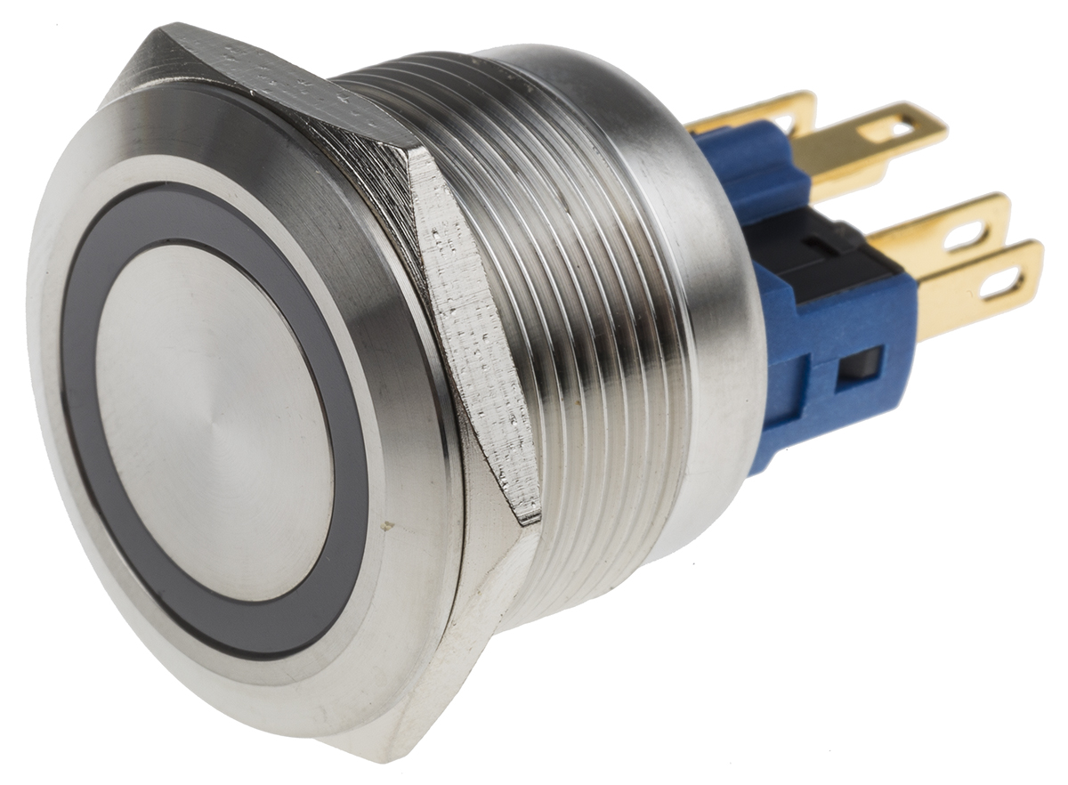 This is SPDT On-Momentary Push Button Switch IP65 IP67 22 (Dia.)mm Panel Mount Blue LED 250V ac manufactured by RS Pro. The manufacturer part number is 811-8534. The product is available in panel mount configuration. Moreover, the product has a nominal 250v ac voltage rating. The terminal is a quick connect type. The product is made from sturdy silver alloy materials.
