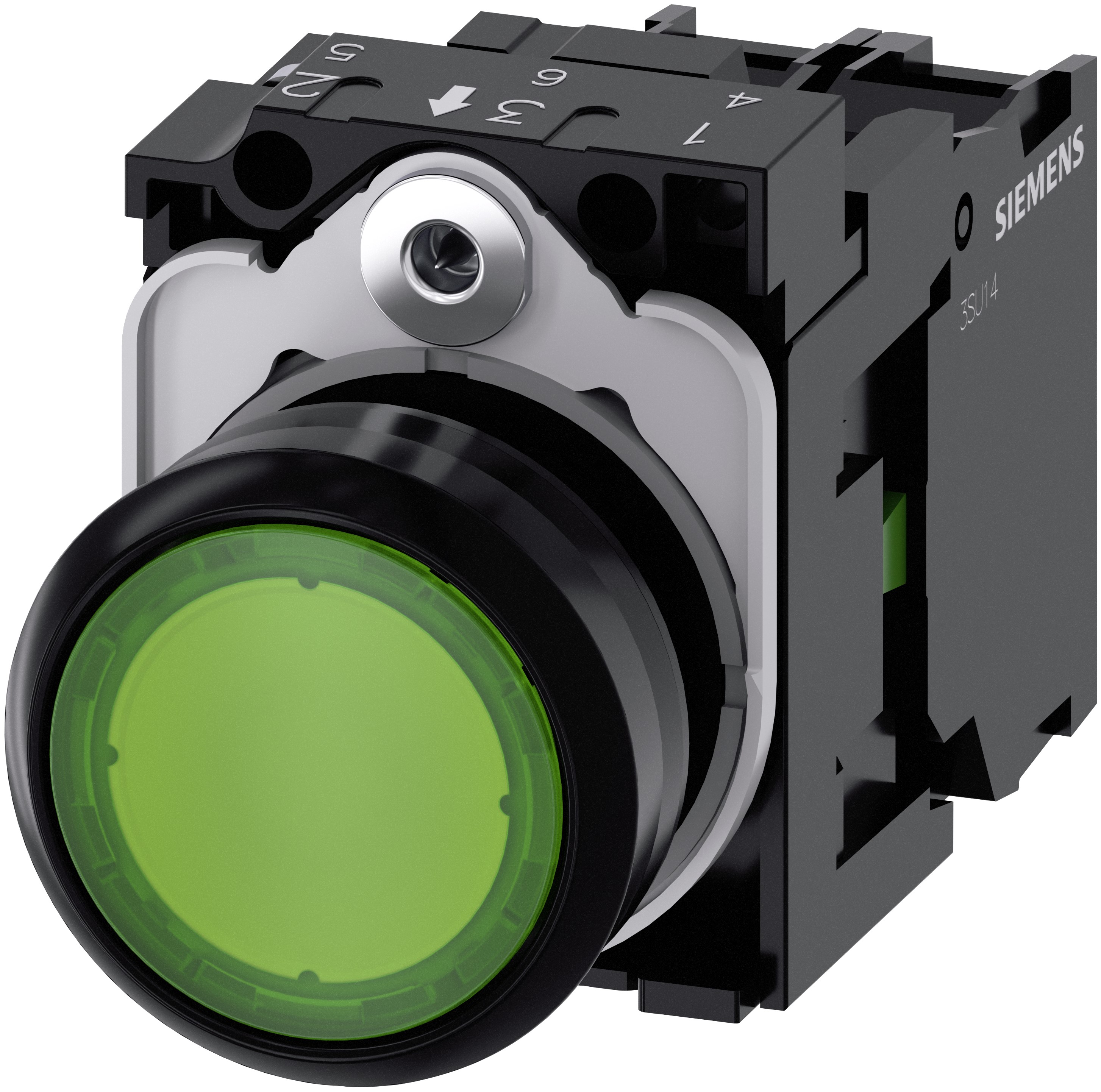 This is SIRIUS ACT Illuminated Green Push Button Complete Unit NO Momentary manufactured by Siemens. The manufacturer part number is 3SU1102-0AB40-1BA0. Legend Information: blank. Moreover, the product has a nominal 24v voltage rating. It has a maximum operating temperature of +70°c. The terminal is a screw type. The product's body is nicely designed from plastic materials. The product is available in panel mount configuration. The product sirius act, is a highly preferred choice for users. Whereas, the minimum operating temperature of the product is -25°c. The product is made from sturdy plastic materials.
