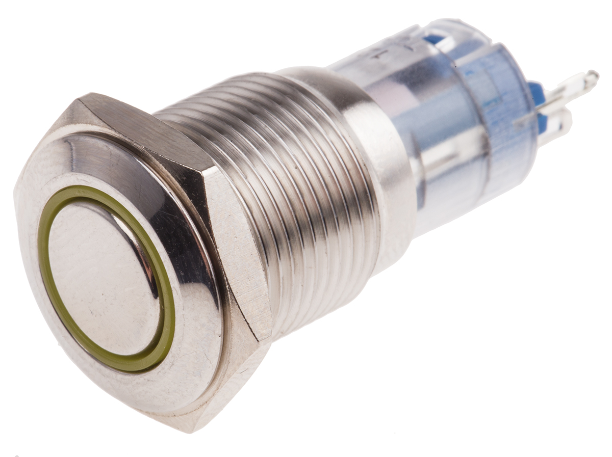 This is SPDT On-Momentary Push Button Switch IP65 IP67 16 (Dia.)mm Panel Mount Yellow LED 250V ac manufactured by RS Pro. The manufacturer part number is 811-8461. The product is available in panel mount configuration. Moreover, the product has a nominal 250v ac voltage rating. The terminal is a solder type. The product is made from sturdy sliver alloy materials.