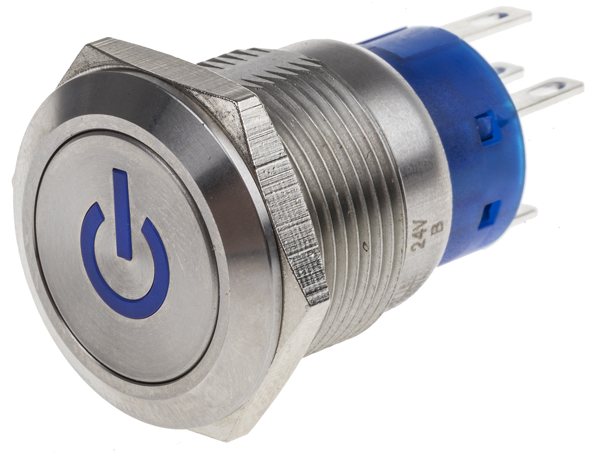 This is SPDT Latching Push Button Switch IP67 19mm Panel Mount Blue LED Power Symbol 250V ac manufactured by RS Pro. The manufacturer part number is 111-3900. The product is available in panel mount configuration. Moreover, the product has a nominal 250v ac voltage rating. The terminal is a solder pin type. Legend Information: power symbol. The product is made from sturdy copper materials.