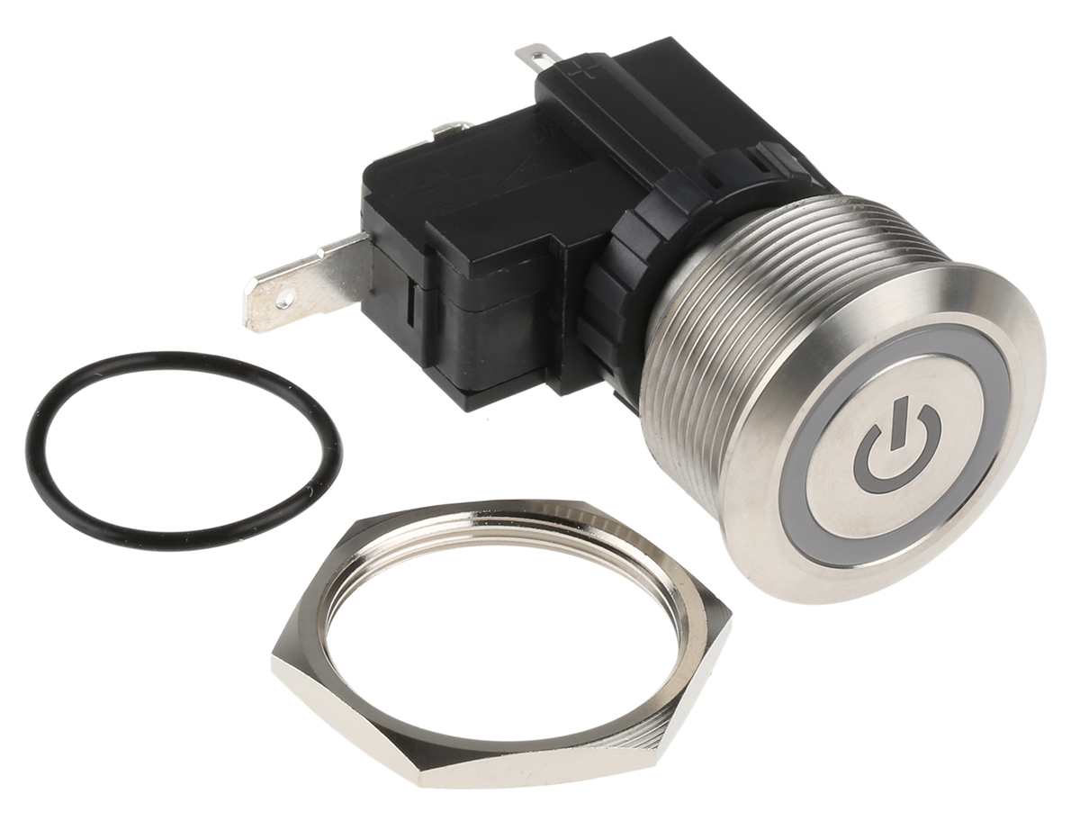 This is 16A SPST-NO + Lock + Ring with Power log manufactured by RS Pro. The manufacturer part number is 175-8166. The product is available in panel mount configuration. Moreover, the product has a nominal 250 / 125v ac voltage rating. The terminal is a quick connect type. Legend Information: power symbol. The product is made from sturdy brass materials.