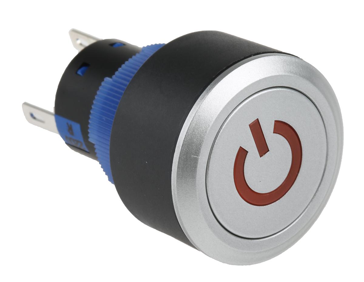 This is 1 Pole + Momentary + Red LED 220V manufactured by RS Pro. The manufacturer part number is 175-8981. The product is available in panel mount configuration. Moreover, the product has a nominal 250v ac voltage rating. The terminal is a solder type. Legend Information: power symbol. The product is made from sturdy brass materials.