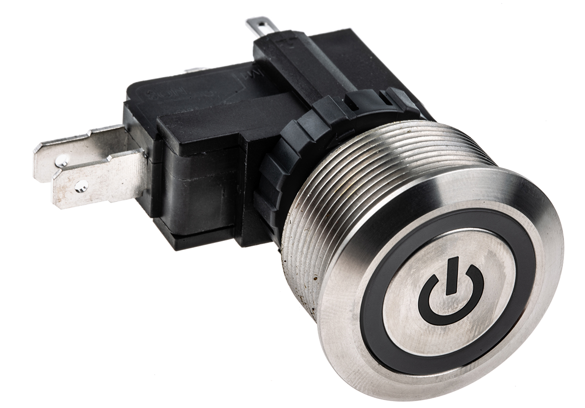 This is Single Pole Double Throw (SPDT) Momentary Push Button Switch IP67 25.2 Dia.mm Panel Mount White LED Power Symbol manufactured by RS Pro. The manufacturer part number is 175-8840. The product is available in panel mount configuration. Moreover, the product has a nominal 250 / 125v ac voltage rating. The terminal is a quick connect type. Legend Information: power symbol. The product is made from sturdy brass materials.