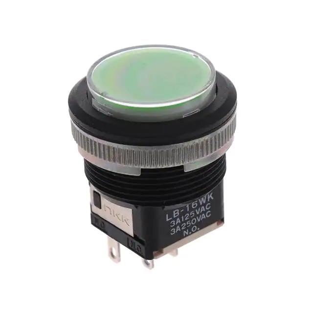 This is manufactured by NKK Switches. The manufacturer part number is LB16WKW01-5F-JF. It is assigned with possible HTSUS value of 8536.50.9033. The product is rohs3 compliant. The product offers long-lasting services of 100,000 cycles. Moreover, it has solder, quick connect - 0.110" (2.8mm) terminal style. 30 v of DC voltage rating. The product has -25°c ~ 50°c operating temperature range. It also has a circular - 22.00mm dia dimensional features. The product also provide mechanical stability with 200,000 cycles. It comes in standard, illuminated configuration. The product exhibits 125 v of AC voltage rating. In addition, it is reach unaffected. It is supplied with led, green illumination. It is shipped in bulk. It is designed as a on-on switching function. Its typical moisture sensitivity level is 1 (unlimited). The actuator marking of the product corelates with no marking. It has an integral spdt circuit. It has a long 26 weeks standard lead time. Additionally, the product's output is 3a (ac/dc) It is IP rated with ip65 - dust tight, water resistant. The product is available in panel mount, front configuration. The product lb, is a highly preferred choice for users. It is made from clear (green filter/diffuser). The product carries round, button actuator. The nominal illumination voltage of the product is 2.1 vdc. Moreover, it corresponds to lb16wkw, a base product number of the product. The product is designated with the ear99 code number