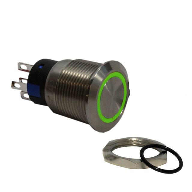 This is manufactured by CIT Relay and Switch. The manufacturer part number is AHU1NBSGN. It is assigned with possible HTSUS value of 8536.50.9031. The product is rohs compliant. The product offers long-lasting services of 50,000 cycles. Moreover, it has solder, quick connect - 0.110" (2.8mm) terminal style. The product has -20°c ~ 65°c operating temperature range. It also has a circular - 19.00mm dia dimensional features. The product also provide mechanical stability with 1,000,000 cycles. It comes in anti-vandal, illuminated configuration. The product exhibits 125 v of AC voltage rating. In addition, it is reach unaffected. It is supplied with led, green illumination. It is shipped in tray. It is designed as a on-mom switching function. Its typical moisture sensitivity level is 1 (unlimited). The actuator marking of the product corelates with no marking. It has an integral spdt circuit. It has a long 9 weeks standard lead time. Additionally, the product's output is 3a (ac) It is IP rated with ip67 - dust tight, waterproof. The product is available in panel mount, front configuration. The product ahu, is a highly preferred choice for users. It is made from silver. The product carries round, button, flush actuator. Moreover, it corresponds to ahu1, a base product number of the product. The product is designated with the ear99 code number