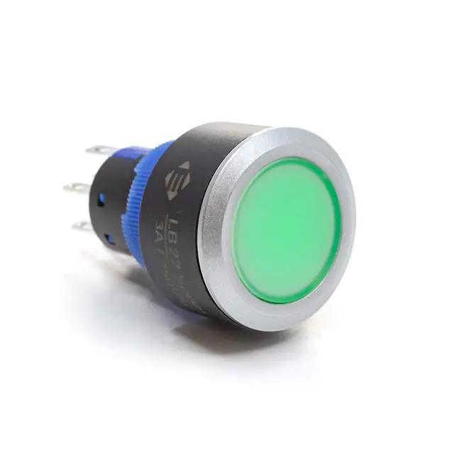 This is manufactured by E-Switch. The manufacturer part number is LB22F23Q3131. It is assigned with possible HTSUS value of 8536.50.9033. The product is rohs3 compliant. The product offers long-lasting services of 50,000 cycles. Moreover, it has solder lug terminal style. The product has -20°c ~ 55°c operating temperature range. It also has a circular - 22.00mm dia dimensional features. It comes in anti-vandal, illuminated configuration. The product exhibits 250 v of AC voltage rating. It is supplied with led, green illumination. It is shipped in tray. It is designed as a on-on switching function. Its typical moisture sensitivity level is 1 (unlimited). It has an integral spdt circuit. It has a long 2 weeks standard lead time. Additionally, the product's output is 3a (ac) It is IP rated with ip65 - dust tight, water resistant. The product is available in panel mount, front configuration. The product lb22, is a highly preferred choice for users. It is made from green. The product carries round, button, flush actuator. The nominal illumination voltage of the product is 3 vdc. The product is designated with the ear99 code number