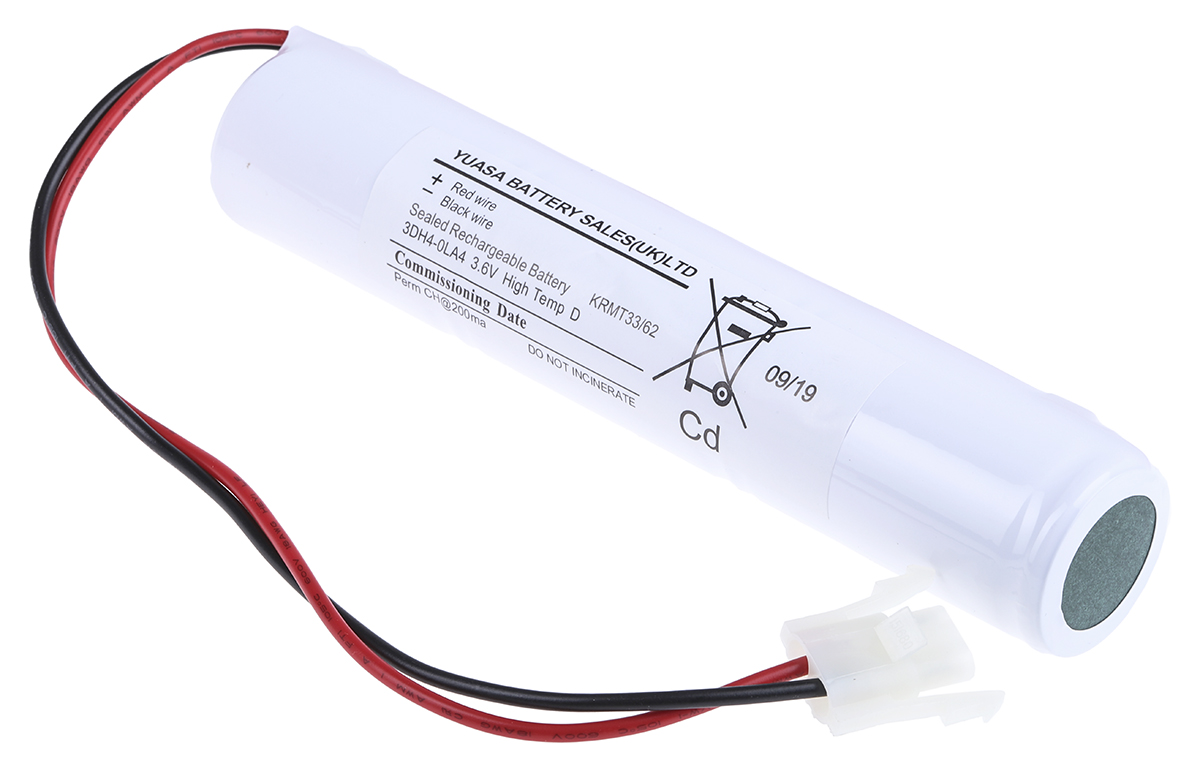 This is 3.6V 4Ah NiCd Emergency Lighting Battery Pack manufactured by Yuasa. The manufacturer part number is 3DH4-0LA4. The module has the capacity of 4ah. It is comprised of 3 cells. The product is available in d size. The terminal is a amp connector type.