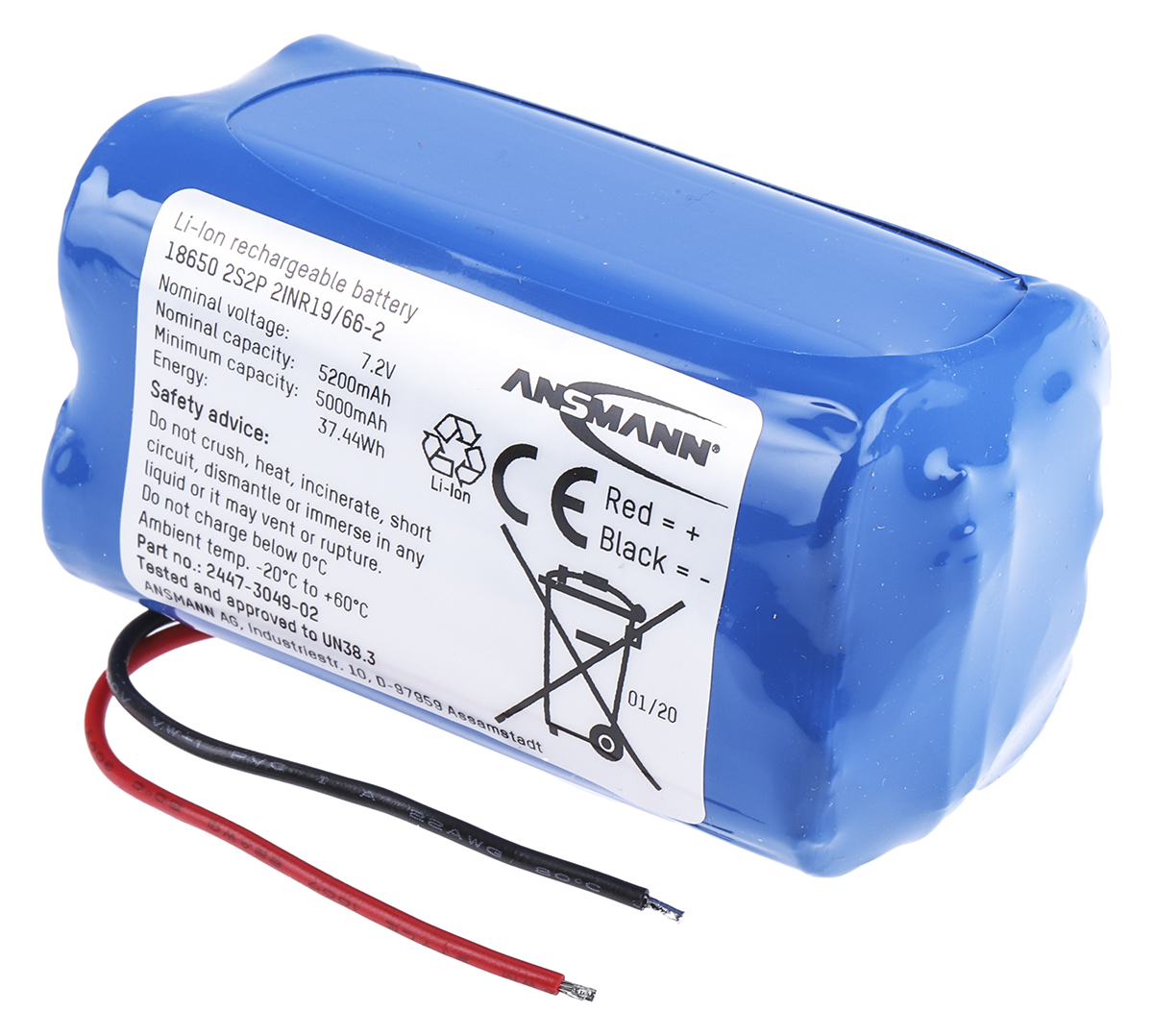 This is 7.4V Rechargeable Lithium Battery Pack 5200mAh manufactured by Ansmann. The manufacturer part number is 2447-3049-520. The module has the capacity of 5.2ah. It is comprised of 4 cells. The terminal is a wire lead type.