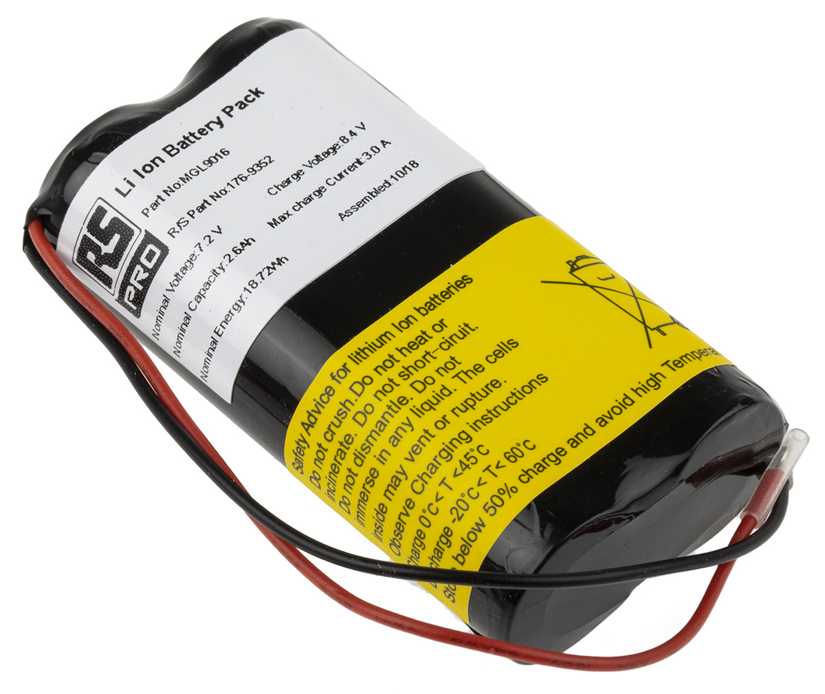This is Li-Ion battery 2S1P (18650) + PCM UN38.3 manufactured by RS Pro. The manufacturer part number is 176-9352. The module has the capacity of 2.6ah. It is comprised of 2 cells. The terminal is a lead type.