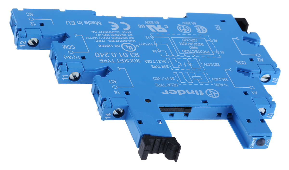 This is 5 pin Relay Socket 250V ac for use with 34.51 34.81 manufactured by Finder. The manufacturer part number is 93.01.0.240. The product has a current rating of 10a. The product is available in din rail configuration. The product 93, is a highly preferred choice for users. It carries a 250v ac of voltage. The product contains 5 contacts.