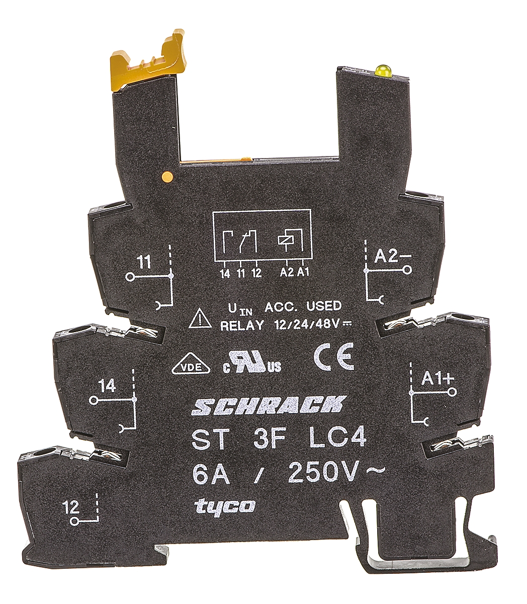 This is Relay Socket 24V dc for use with SNR Series manufactured by TE Connectivity. The manufacturer part number is ST3FLC4. The product is available in din rail configuration. The product has a current rating of 6a. It carries a 24v dc of voltage.