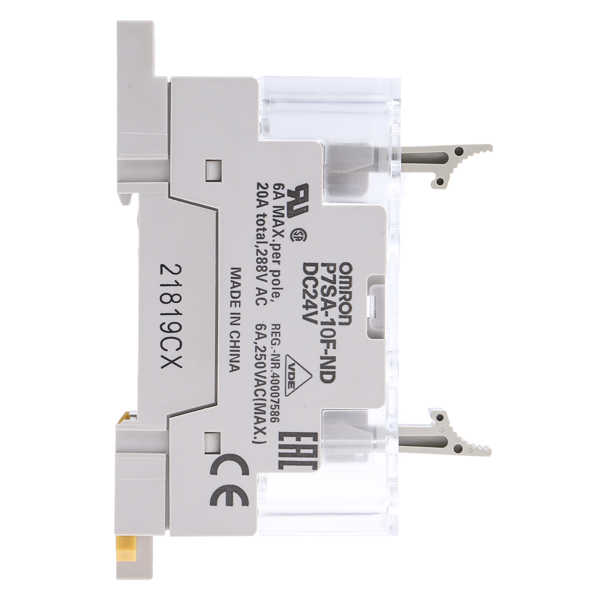 This is 10 pin Relay Socket DIN Rail 24V dc for use with G7SA Series manufactured by Omron. The manufacturer part number is P7SA-10F-ND DC24. The product has a current rating of 10a. The product is available in din rail configuration. It carries a 24v dc of voltage. The product contains 10 contacts.