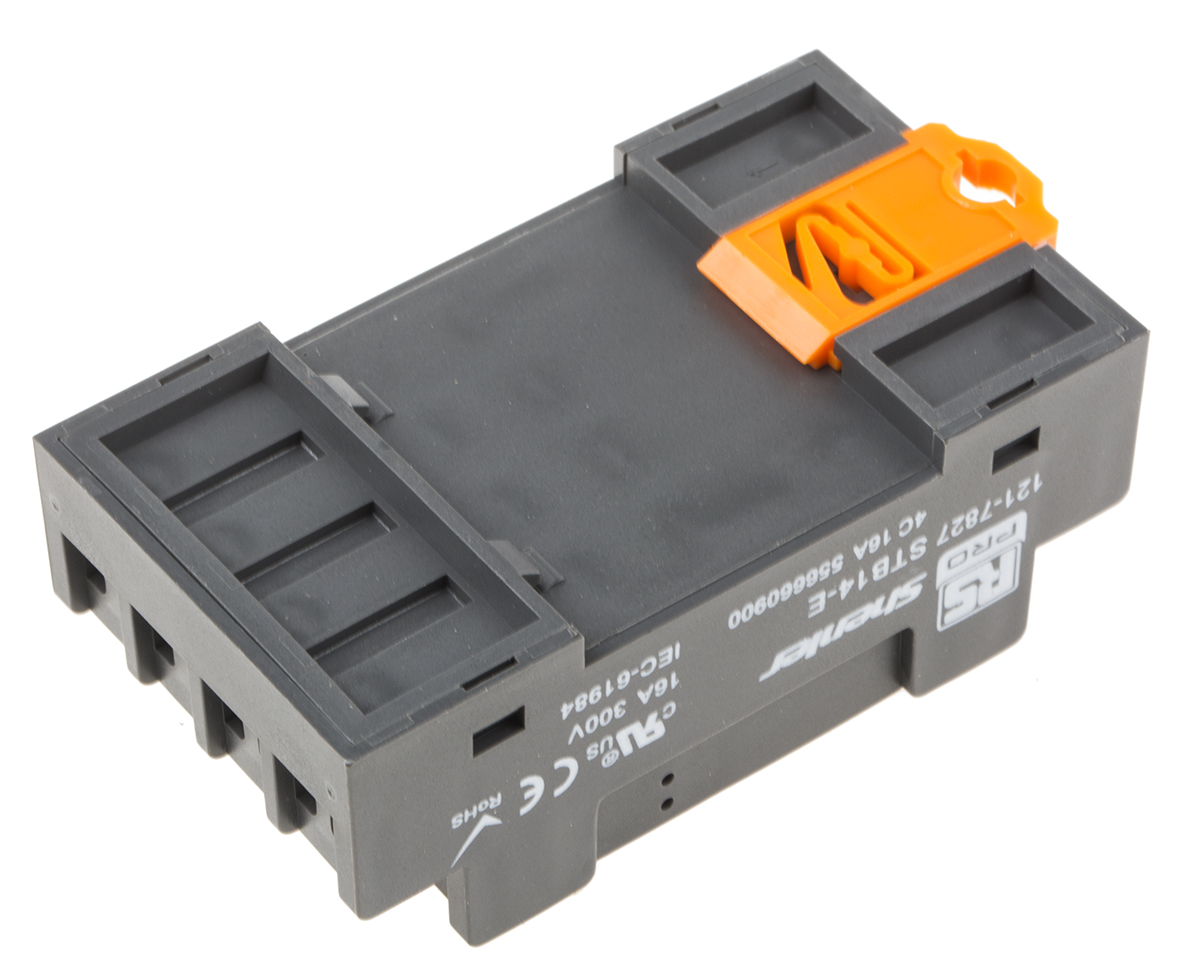 This is 14 Pin Relay Socket DIN Rail 300V for use with RKL Relays 4PDT manufactured by RS Pro. The manufacturer part number is 121-7827. The product has a current rating of 16a. The product is available in din rail configuration. It carries a 300v of voltage. The product contains 14 contacts.