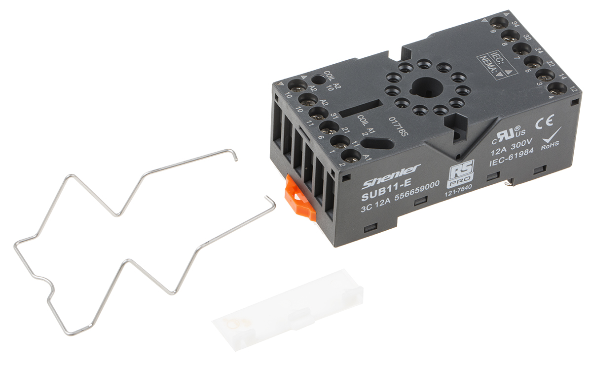 This is 11 Pin Relay Socket DIN Rail 300V for use with RUB Relays manufactured by RS Pro. The manufacturer part number is 121-7840. The product has a current rating of 12a. The product is available in din rail configuration. It carries a 300v of voltage. The product contains 11 contacts.
