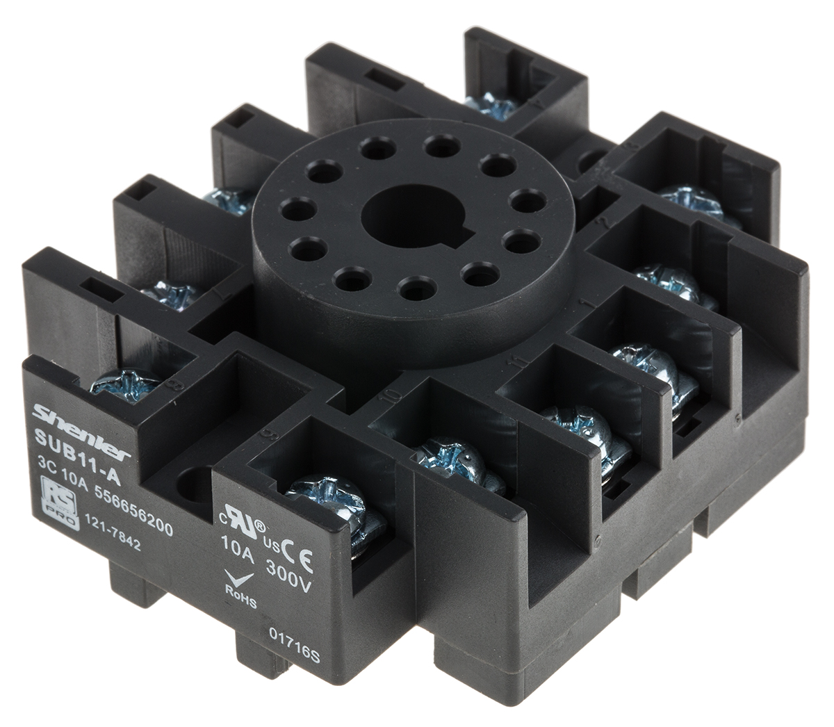 This is 11 Pin Relay Socket DIN Rail 300V for use with RUB Relays manufactured by RS Pro. The manufacturer part number is 121-7842. The product has a current rating of 15a. The product is available in din rail configuration. It carries a 300v of voltage. The product contains 11 contacts.