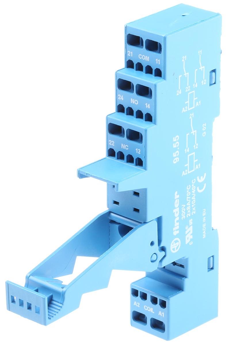 This is Relay Socket for use with 40.52 40.61 44.52 44.62 40.51 Series Relay manufactured by Finder. The manufacturer part number is 95.55SPA. The product has a current rating of 10a. The product is available in din rail configuration. The product 95, is a highly preferred choice for users. It carries a 250v ac of voltage. The product contains 8 contacts.
