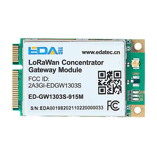 This is manufactured by EDATEC. The manufacturer part number is ED-GW1303S-915M. The product is rohs3 compliant. The product has 0°c ~ 60°c operating temperature range. Moreover, the product comes in [Package/ Case]. It carries 306ma transmission current. The current receiving of the product is 54ma. Features lora modulation. It is shipped in box. Its typical moisture sensitivity level is 1 (unlimited). The standard RF Family of the product includes navigation. The product features a lora protocol. Additionally, [Utilised IC / Part] is the used part of the product. The product is available in mini pcie configuration. It is a antenna not included antenna. The product ed-gw1303, is a highly preferred choice for users. The sensitivity given includes -141dbi. It features spi serial interface. Supplied with 902mhz ~ 928mhz of frequency. It has optimum voltage supply of 3v ~ 3.6v. The product has an output power 25dbm.