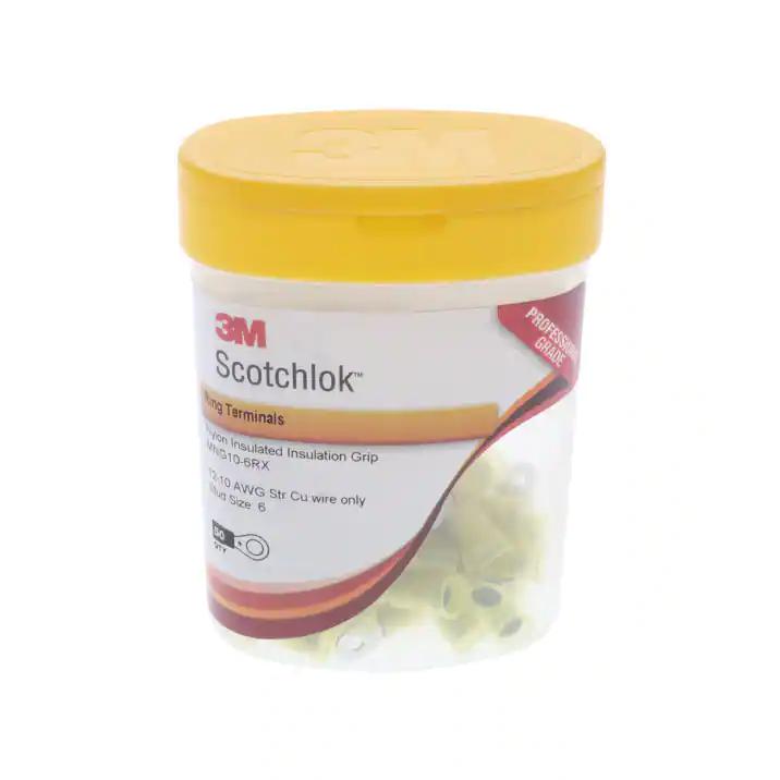 This is manufactured by 3M. The manufacturer part number is MNG10-6RX-BOTTLE. It is assigned with possible HTSUS value of 8536.90.4000. The product is rohs compliant. It is 0.040" (1.02mm) thick. It is designed from highly reliable polyamide (pa), nylon insulating material. The product has an integral 1.030" (26.16mm) overall length. In addition, it is reach unaffected. The product's insulation diameter includes 0.250" (6.35mm). The terminal is a circular type. It is shipped in bulk. Moreover, the product has a wire gauge of 10-12 awg. Its outer edges are 0.380" (9.65mm) wide. Furthermore, the product is galvanized with excellent tin contact finishing. Its typical moisture sensitivity level is 1 (unlimited). The product features crimp termination style. It has a long 3 weeks standard lead time. The product consists of 6 stud. The product is available in free hanging (in-line) configuration. It has a classic yellow colour. The product scotchlok™, is a highly preferred choice for users. Insulation Option: insulated. The product is designated with the ear99 code number Moreover, it corresponds to mng10, a base product number of the product. The product is made from sturdy copper, etp materials.