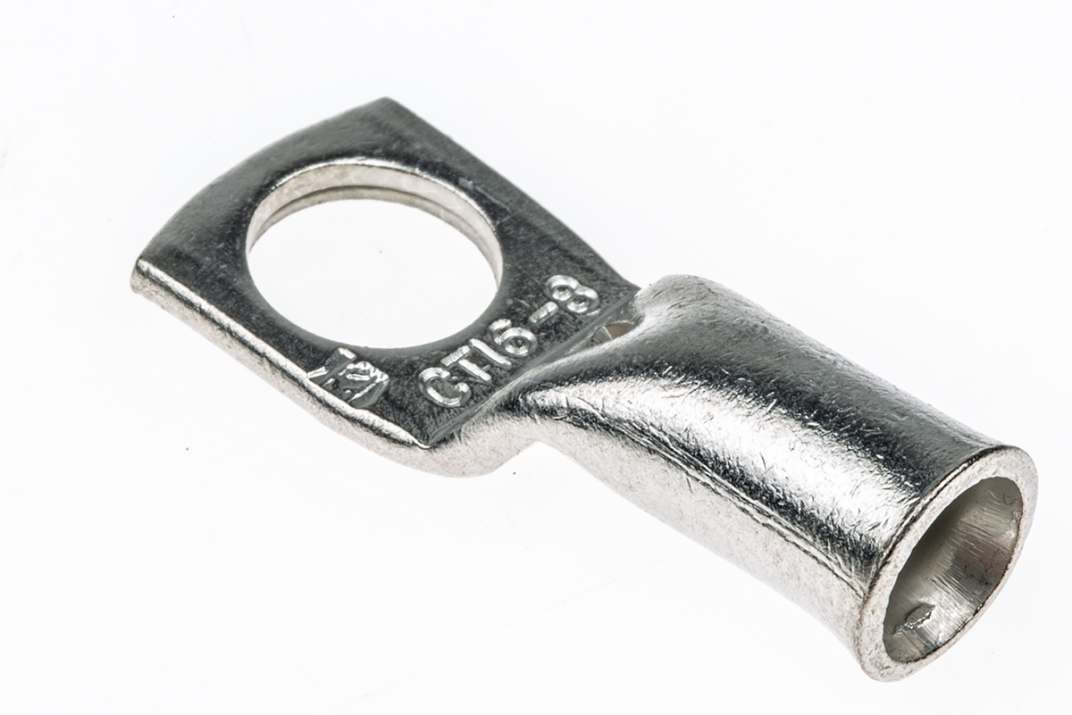 This is CT Series Uninsulated Tin Plated Tubular Ring Terminal M8 Stud Size 16mm² to 16mm² manufactured by RS Pro. The manufacturer part number is 531-059. Insulation Option: uninsulated. The product is made from sturdy copper materials.