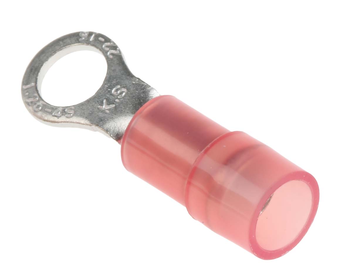 This is RNYD Series Insulated Tin Plated Crimp Ring Terminal M4 (#8) Stud Size 0.5mm² to 1.5mm² 22AWG to 16AWG manufactured by RS Pro. The manufacturer part number is 267-3638. It is 0.75mm thick. It has a robust nylon insulation material. Insulation Option: insulated. The product is made from sturdy copper materials.