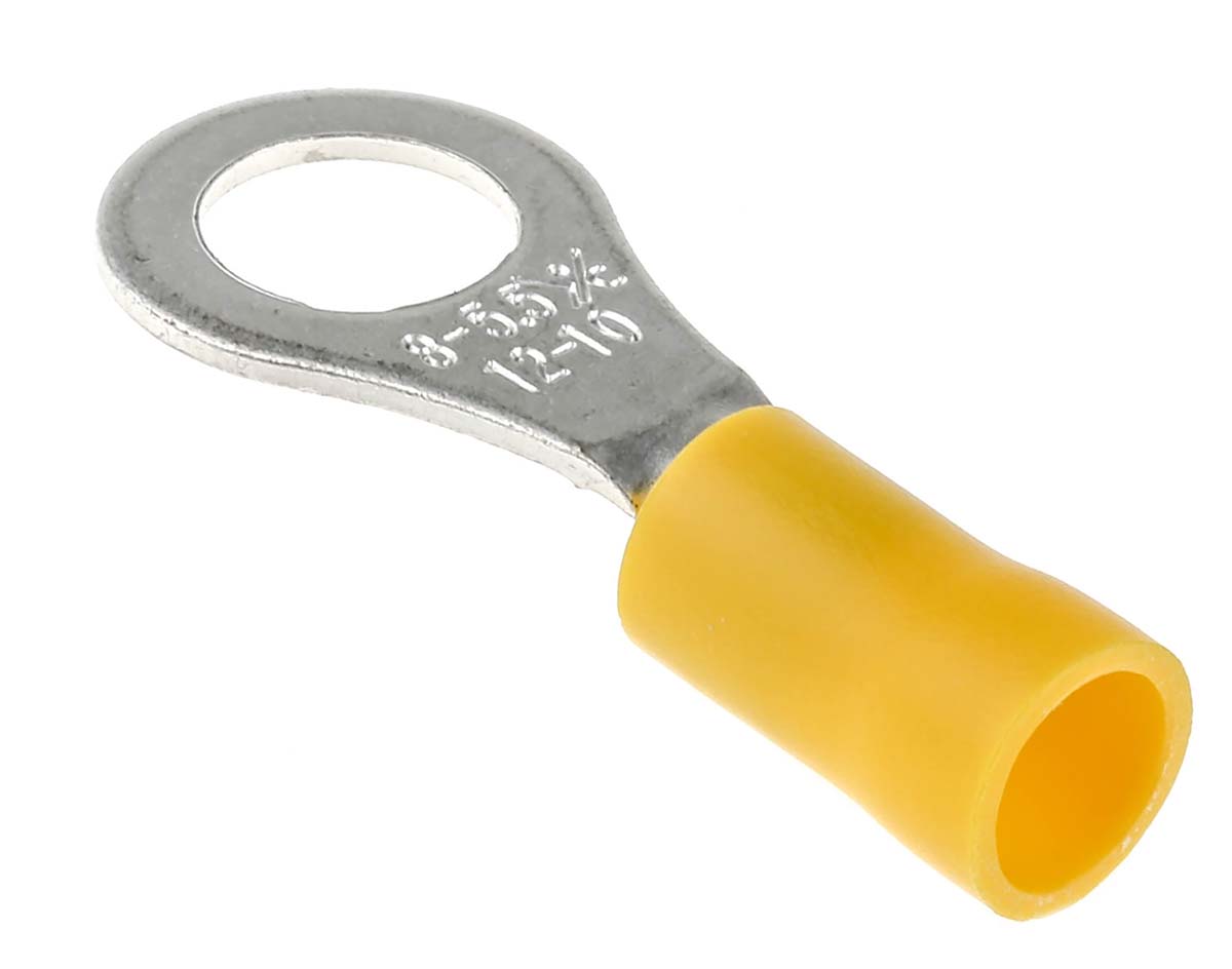 This is Insulated Tin Plated Crimp Ring Terminal M8 Stud Size 2.5mm² to 6mm² 12AWG to 10AWG Yellow manufactured by RS Pro. The manufacturer part number is 534-424. It is 1mm thick. It has a robust pvc insulation material. Insulation Option: insulated. The product is made from sturdy copper materials.