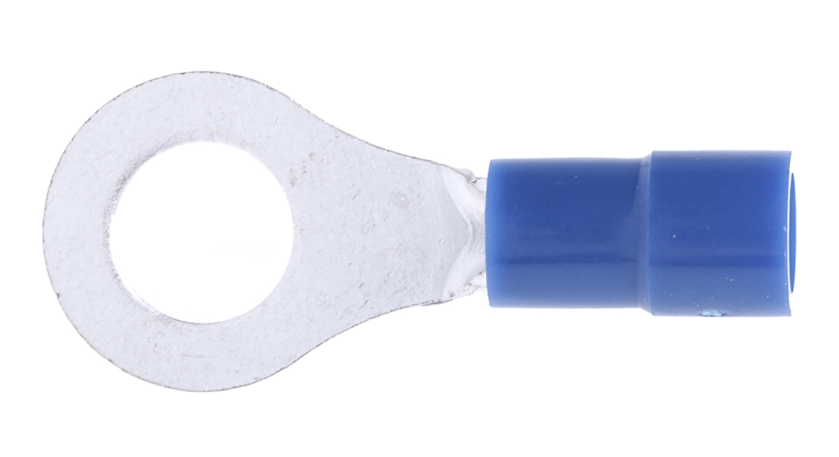 This is Insulated Tin Plated Crimp Ring Terminal M6 Stud Size 1.5mm² to 2.5mm² 16AWG to 14AWG Blue manufactured by RS Pro. The manufacturer part number is 613-9328. It is 0.8mm thick. It has a robust vinyl insulation material. Insulation Option: insulated. The product is made from sturdy copper materials.