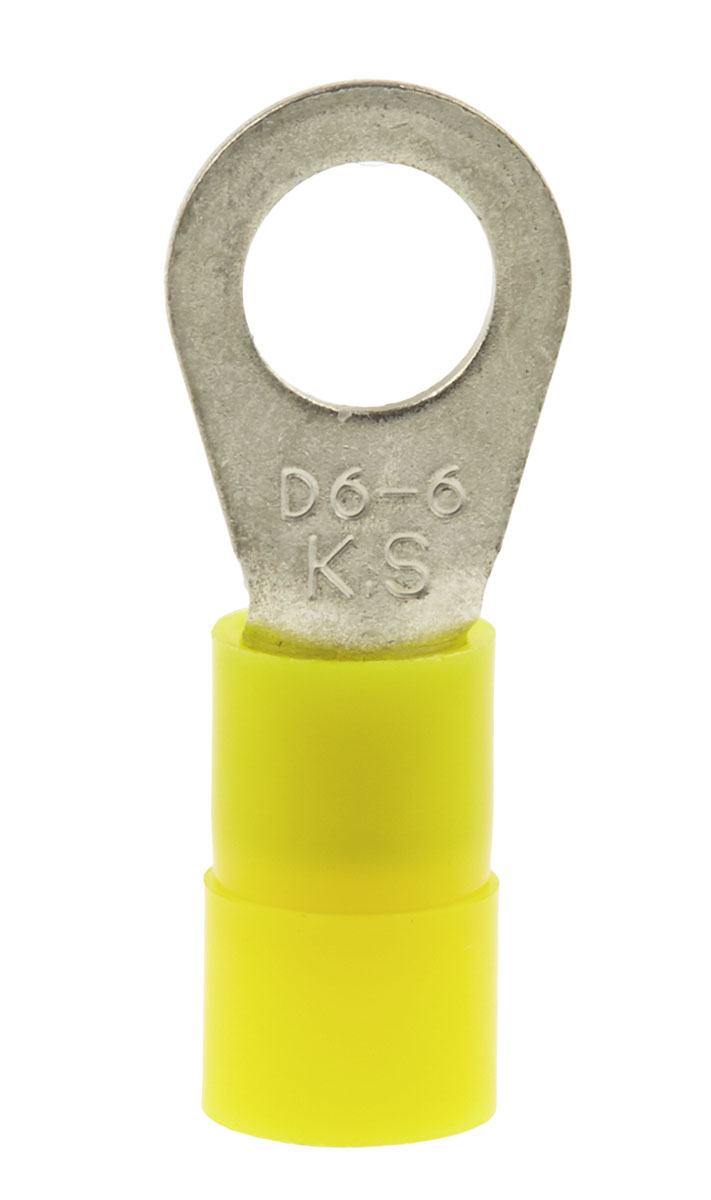 This is Insulated Crimp Ring Terminal 6.5mm Stud Size 2.5mm² to 6mm² Wire Size Yellow manufactured by RS PRO. The manufacturer part number is 178-7263. It is 1mm thick. It has a robust nylon insulation material. Insulation Option: insulated. It has a maximum operating temperature of +105°c. The product is made from sturdy copper materials.